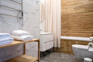 Просторный санузел с ванной: ванна, средства личной гигиены, фен Dyson для волос, набор полотенец