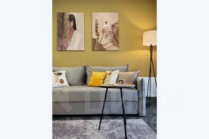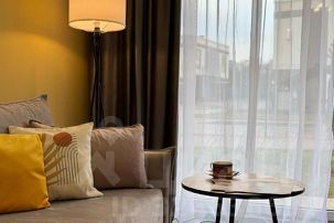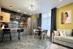 Просторный и светлый интерьер дополнен комфортным раскладным диваном, который с легкостью разместит ещё двух гостей, обеспечивая уютное пространство для совместного времяпровождения.