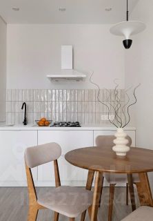 -комфортные стулья в велюре, круглый стол, встроенный холодильник и духовой шкаф, варочная панель, микроволновая печь, вытяжка;