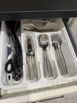 - На кухне: эл. чайник, микроволновая печь, газовая плита, холодильник с морозильной камерой, посудомоечная машина, посуда, моющ. ср.