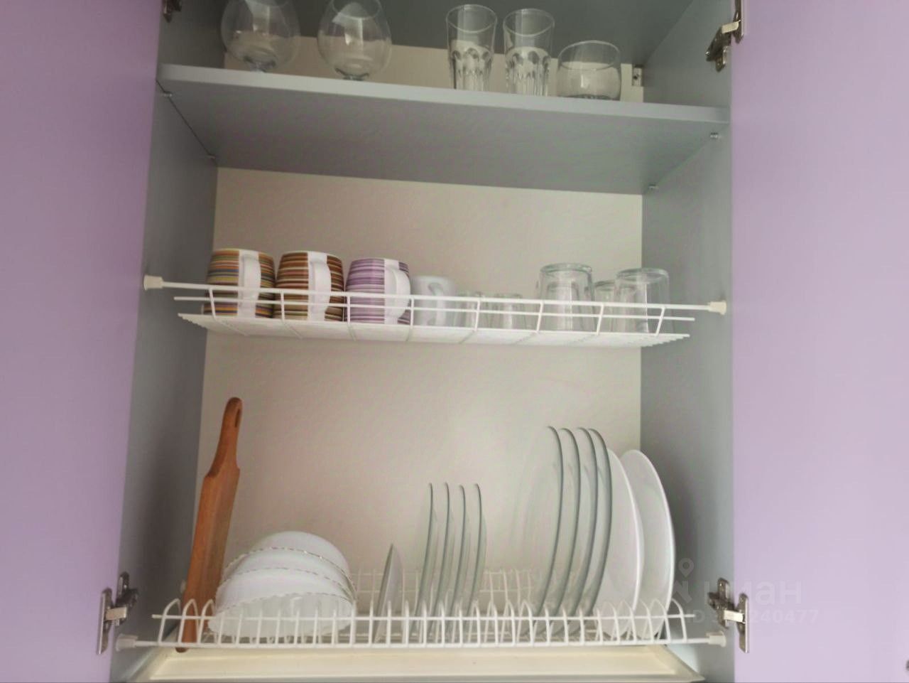 - Посуда в шкафчиках на 4 персоны. А также кастрюли, миски, сковородки.