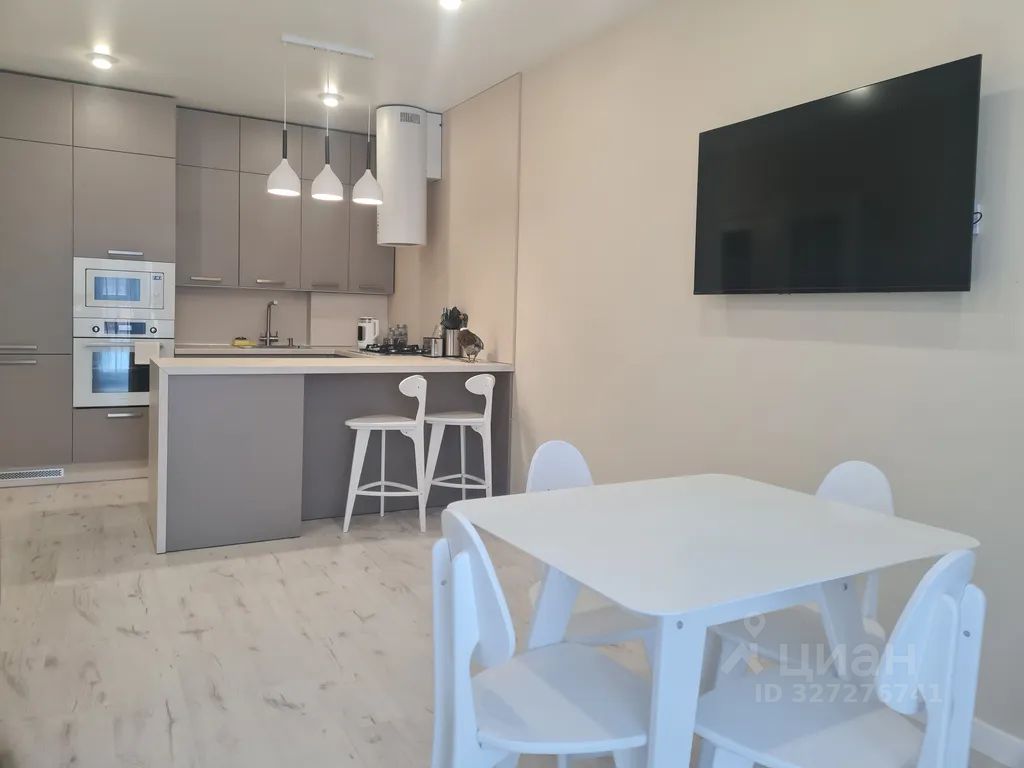Большая гостиная-столовая с продуманной зоной для готовки и комфортной зоной для отдыха и общения.