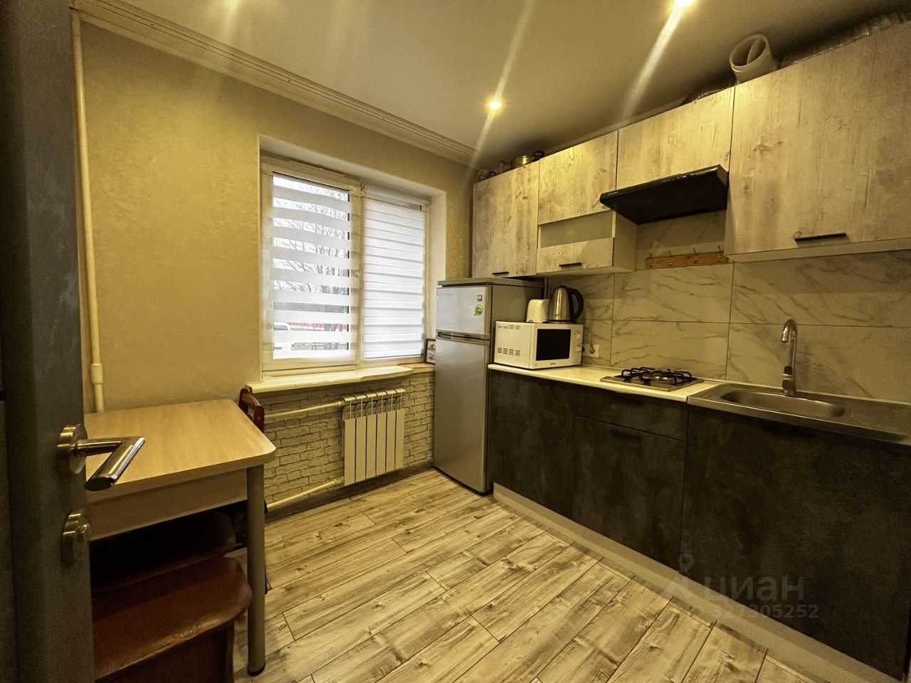 Просторная кухня площадью 9 мг оснащена необходимой бытовой техникой, включая холодильник и микроволновую печь.
