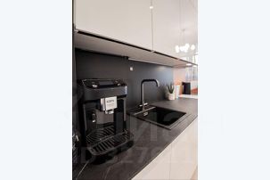 Кухня: кофе машина, посудомоечная машина, индукционная плита, микроволновка, холодильник, полный набор посуды и столовые приборы.