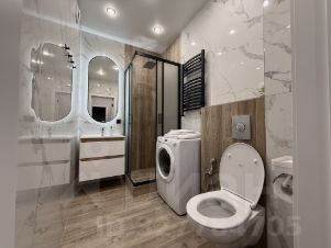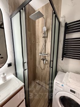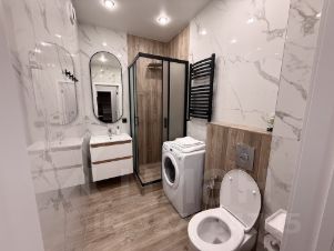 Санузел совмещенный, оформлен в светлых тонах с использованием современных материалов. Имеется душевая кабина и стиральная машина.