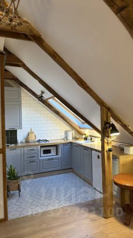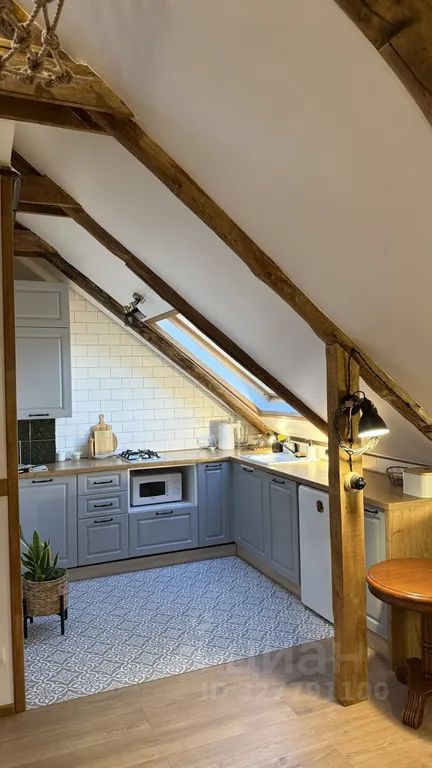 мансарда находится на 3-м этаже. Мы обустроили для вас гостиную, совмещенную с кухонной зоной, изолированную спальню с небольшим балкончиком и отдельную спальную зону для детей — чердачок на втором ярусе.