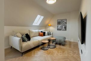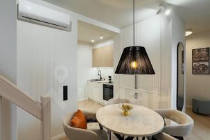 Просторное и очень светлое пространство. Кухня полностью укомплектована: есть рожковая кофеварка для ароматного эспрессо по утрам и всё необходимое для приготовления ужина. В зоне гостиной — огромный уютный (и очень фотогеничный!) диван и Smart TV.