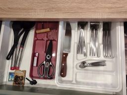 полный комплект посуды, столовых приборов и других кухонных принадлежностей.