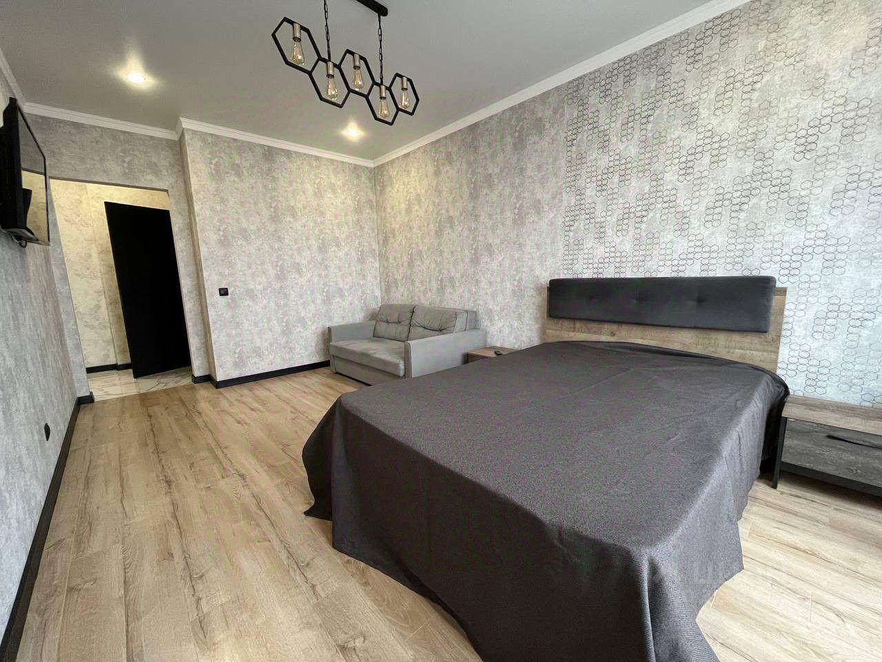 - просторная гостиная с двухспальной кроватью с ортопедическим матрасом, диваном и телевизором.