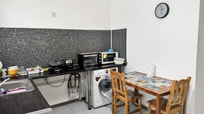 Холодильник, микроволновая печь, стиральная машина, электрочайник, посуда.