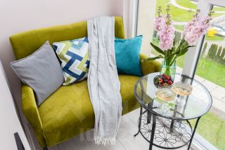На лоджии мягкий диванчик со столиком . Окна панорамные в пол , с прекрасным видом на город