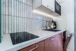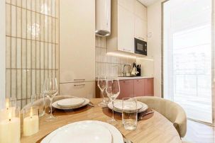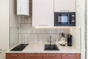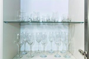 - кухонная зона — кухонный гарнитур, электрическая варочная поверхность, микроволновка, электрический чайник, вся необходимая посуда, холодильник, посудомоечная машина;