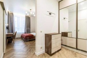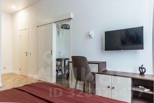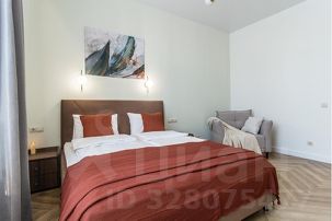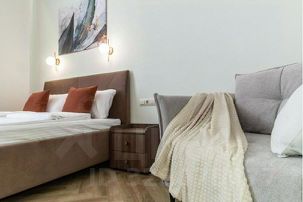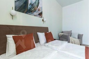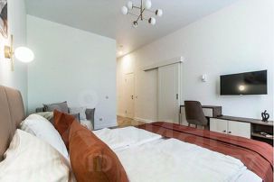 - в спальной зоне большая современная кровать с телевизором, раскладным креслом и столиком;