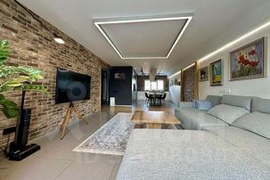 Гостиная зона - огромный диван, телевизор, журнальный столик, современные световые решения;