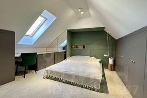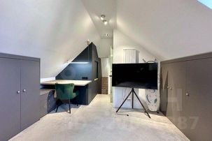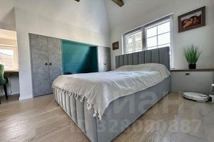 Вторая спальная зона на втором этаже - большая двуспальная кровать, две рабочие зоны, жк телевизор, вместительный дизайнерский шкаф, второй туалет и душевая;
