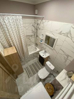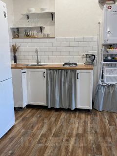Сан узел совмещен и выложен плиткой. Большая кухня- гостиная где можно принимать гостей, отдельная спальня- личное пространство, большая гардеробная.