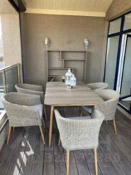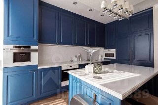 Кухня оснащена встроенной техникой: винный шкаф, морозильная камера, кофемашина, остров с каменной столешницей. В мойке установлен измельчитель.