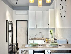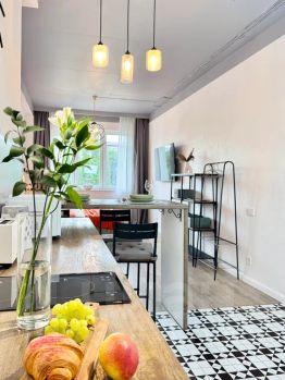 Позавтракать вы можете как в апартаментах — для вас предусмотрена обустроенная кухня, так и спустившись вниз — там вы обнаружите разнообразные кофейни и рестораны с различной кухней на любой вкус.
