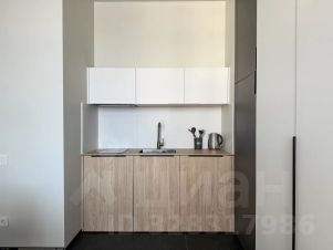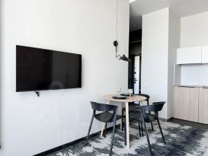 кухня-гостиная: индукционная плита, микроволновка, холодильник, обеденная зона;