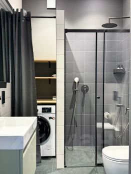 ванная комната с душем и стиральной машиной;