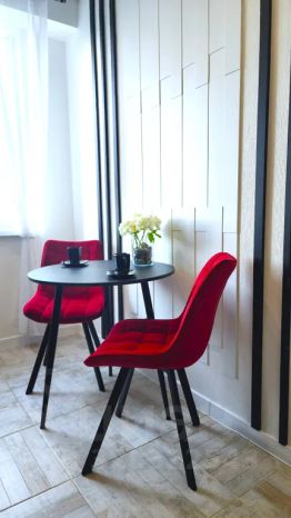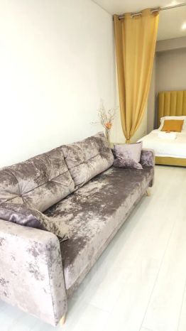 Интерьер квартиры выполнен с использованием текстиля высочайшего качества, создавая атмосферу уюта и комфорта. Гостиная оборудована двуспальной кроватью с балдахином, создающий неповторимые ощущения уединения и умиротворенности, раскладным диваном. Кухня оснащена современной индукционной плитой, холодильником, посудомоечной машиной и всей необходимой посудой.