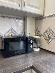 кофеварка, холодильник, микроволновка, установлен фильтр для воды.