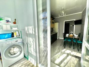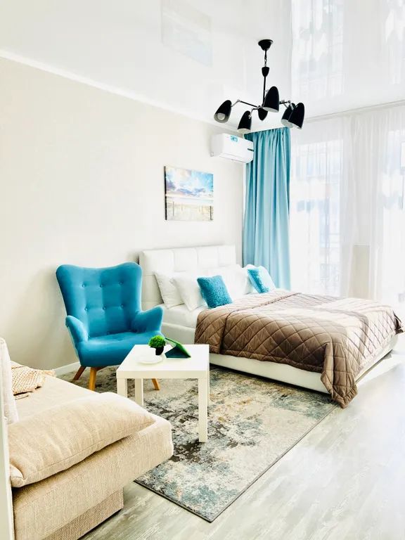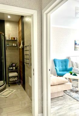 Просторная однокомнатная квартира на 9 этаже дома 2018 г постройки с современным дизайном в оттенках Балтийского моря, расположена в закрытом ЖК в северо-восточной части Зеленоградск, с идеальным выездом на Куршскую косу.