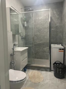 Просторный санузел с тропическим душем: стиральная машинка, предметы личной гигиены, фен для волос, набор полотенец.