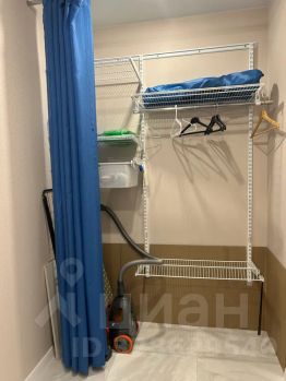 В коридоре гардеробная с занавесками и открытой вешалкой, также есть утюг, пылесос, микроволновка.