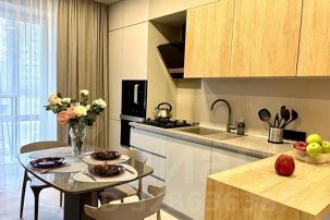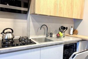 • Полностью оборудованная кухня: посуда, приборы, кастрюли, сковородки, микроволновка, холодильник, чайник, посудомоечная машина, газовая плита — готовьте любимые блюда с удовольствием.