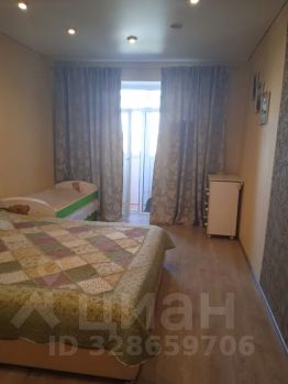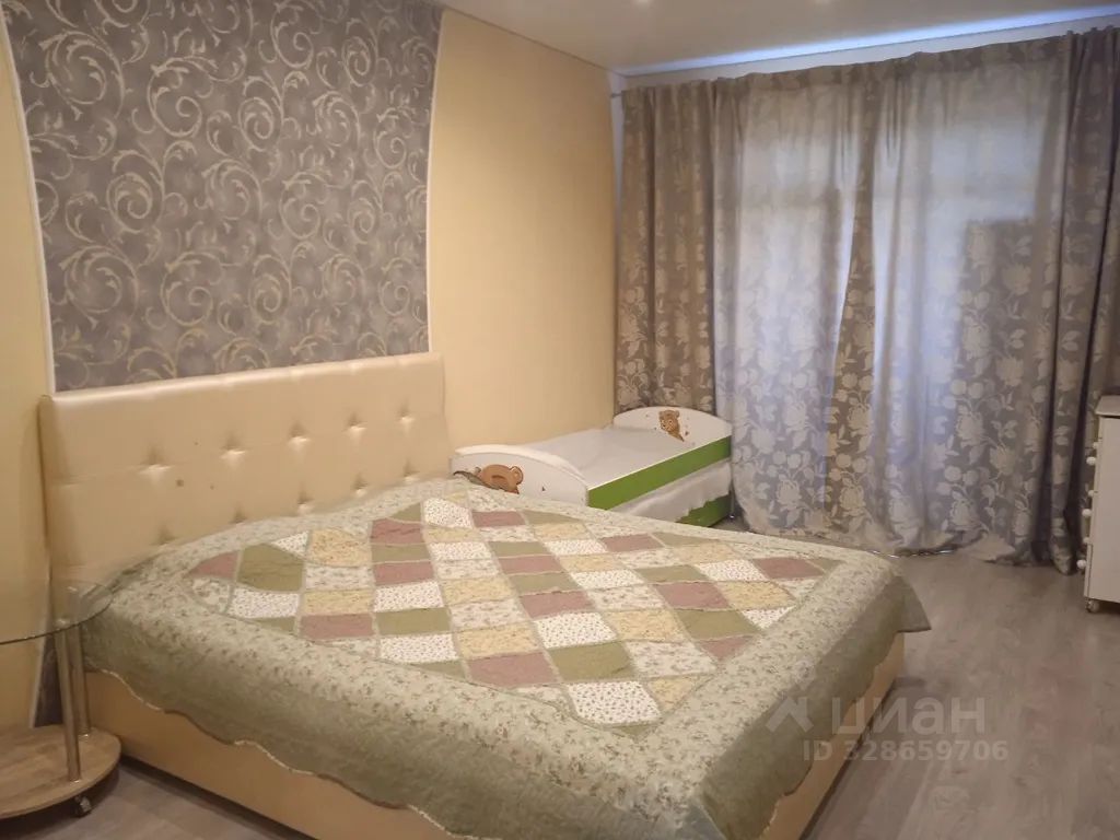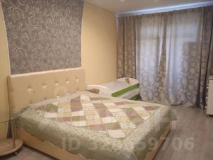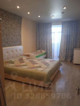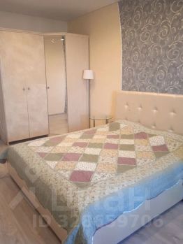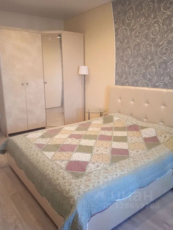 Спальня: большая двуспальная кровать (поместятся 2 взрослых и ребенок), большой угловой шкаф, рабочий стол с компьютером, комод, телевизор (с приставкой "Смарт"), лоджия.