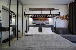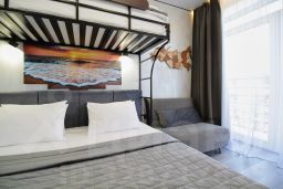 Спальная зона: двухъярусная кровать: первый ярус двуспальная кровать 160200 см, второй ярус односпальная кровать 90200 см, постельное бельё, ТВ. Выход на балкон с видом на море.