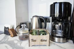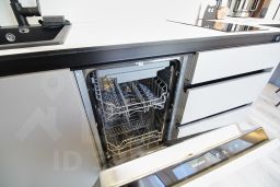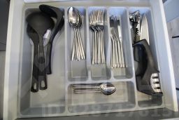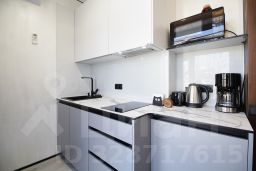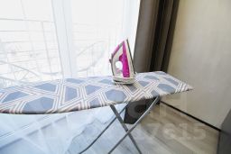 Кухня-гостиная: раскладной диван (110200 см), холодильник, микроволновая печь, индукционная плита, электрический чайник, кофеварка, посудомоечная машина, посуда (бокалы, чашки, столовые приборы, сковорода, кастрюля и т.п.), чай/кофе, обеденная зона. Утюг и гладильная доска.