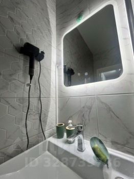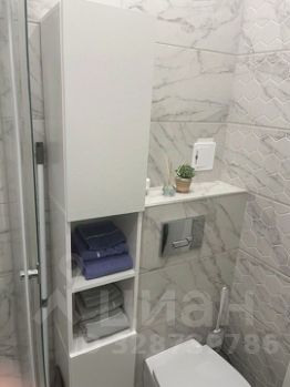 Ванная комната оформлена в современном стиле, оснащена душевой кабиной и стиральной машиной;