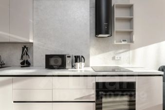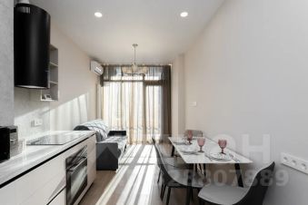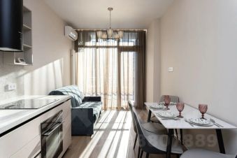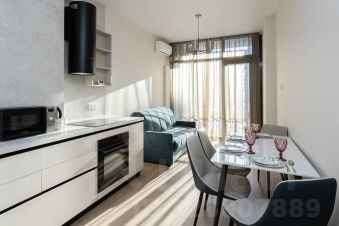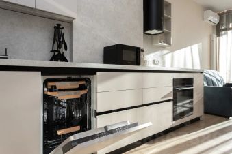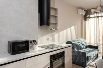 Кухня-гостиная оборудована: кондиционером, холодильником с морозильной камерой, микроволновой печью, электрической варочной панелью, духовым шкафом, электрическим чайником и диваном-кроватью.