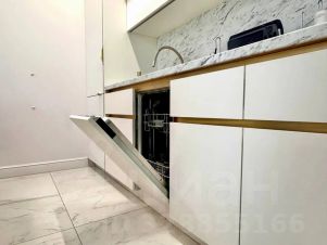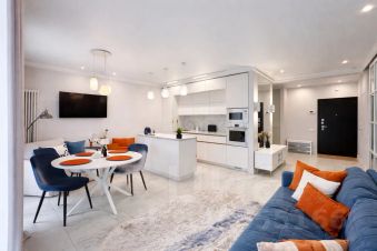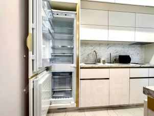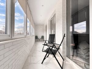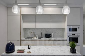 - Кухонная зона — большой телевизор и остров, кухонный гарнитур, электрическая варочная поверхность, микроволновка, духовой шкаф, электрический чайник, вся необходимая посуда на шесть персон, холодильник, посудомоечная машина, выход на огромный балкон!