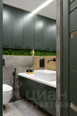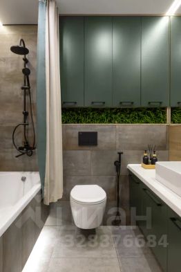 Современная ванная комната (стиральная машина, фен, средства гигиены, моющие принадлежности, качественные пушистые полотенца).