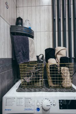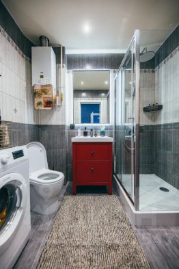 Совмещённыйсанузелсдушевойкабиной итропическимдушем, стиральнаямашина, электрический полотенцесушитель, фен, полотенца, средствагигиены(зубная щётка и паста, шампунь, гельдлядуша,