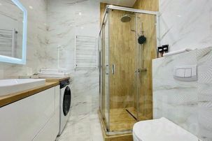 - просторный санузел с душевой и гигиеническими средствами, вместительный шкаф, фен, утюг, гладильная доска, стиральная машинка.
