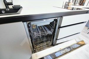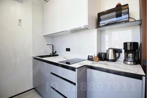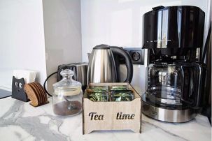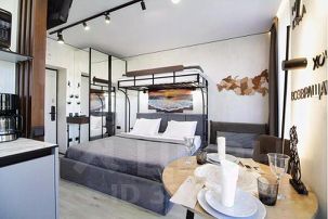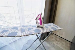 Кухня-гостиная: раскладной диван (110200 см), холодильник, микроволновая печь, индукционная плита, электрический чайник, кофеварка, посудомоечная машина, посуда (бокалы, чашки, столовые приборы, сковорода, кастрюля и т.п.), чай/кофе, обеденная зона. Утюг и гладильная доска.