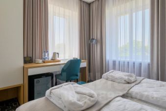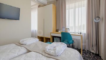 Двухкомнатный четырехместный номер стандарт с двумя двуспальными кроватями. Номер оснащен кондиционером, телевизором, мини-холодильником, шкафом, телефоном. Собственная ванная комната оборудована душем, бесплатными туалетно-косметическими принадлежностями, феном, тапочками и халатами.