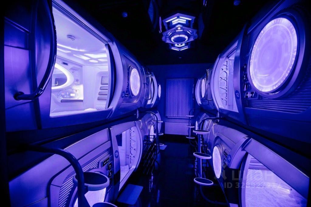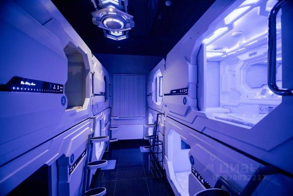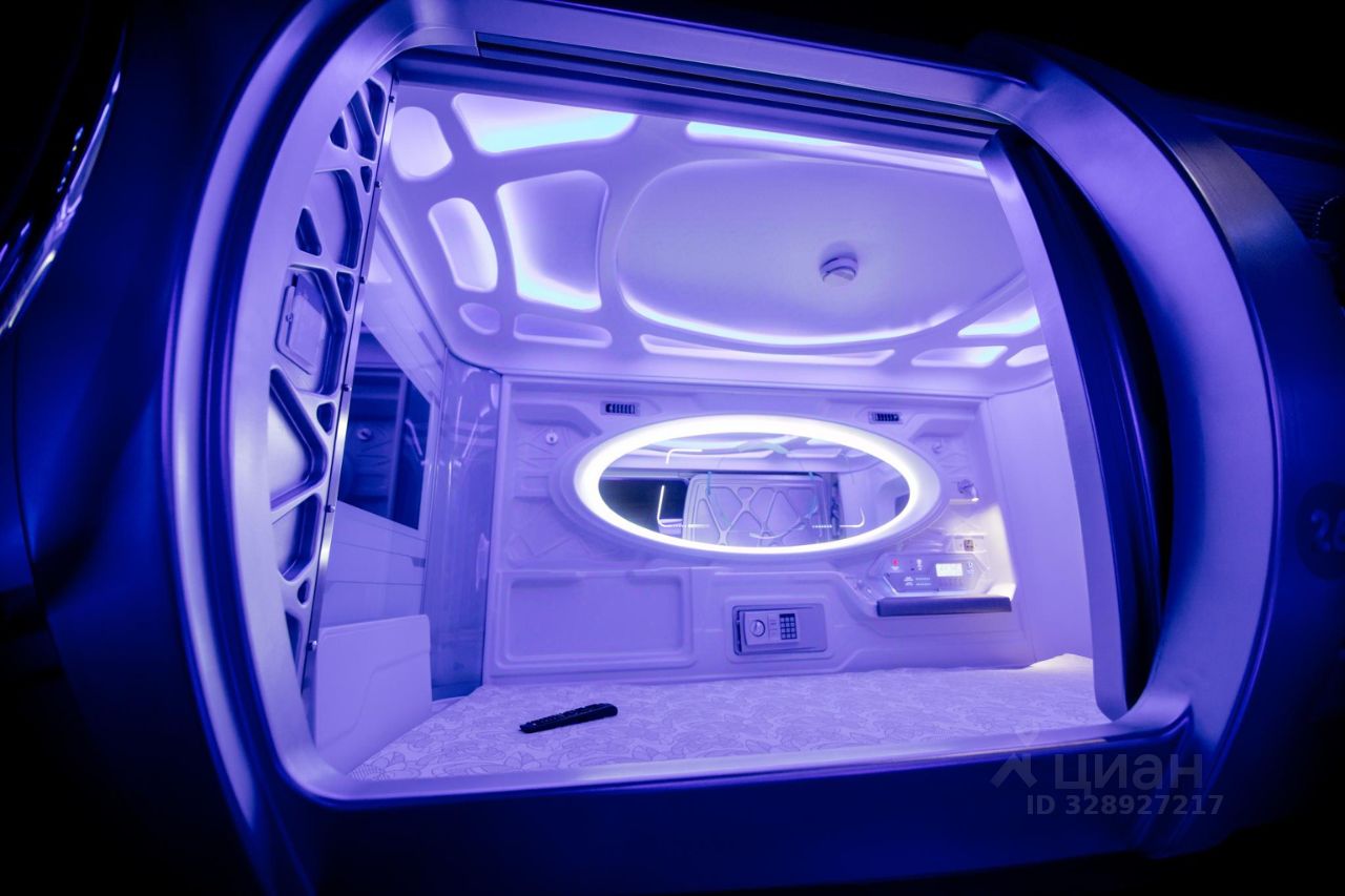 Капсула с ортопедическим матрасом, LED-освещением, розетками, вентиляцией и кондиционированием. Просмотр телевизора в капсуле возможен при наличии наушников. Четыре туалетные комнаты, расположены на 1 и 2 этажах, душевые кабины - на 2 этаже.