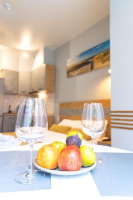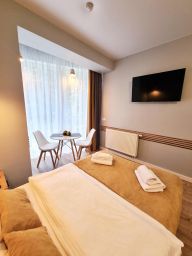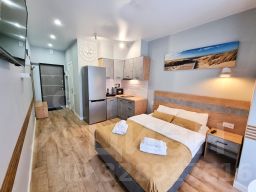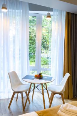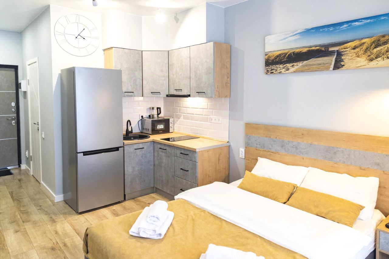 Комплекс апартаментов "Дюна состоит из семи уютных студий для проживания от 2-х до 4-х человек. В каждом апартаменте обустроена современная кухня (варочная панель, вытяжка, холодильник, чайник, необходимая посуда). Ванная комната оборудована качественной сантехникой, стиральной машинкой, душевой кабиной. Двухспальная кровать, в некоторых номерах имеется комфортный диван. В комнате имеется телевизор и Wi-Fi. Если путешествуете с малышом предоставим детскую кроватку и стульчик для кормления. Апартаменты находятся в центре города, но в стороне от шумных заведений, недалеко от моря и озера "Тихое" в другую сторону.