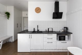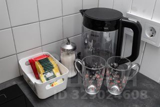 Полностью оборудованная кухня: плита, микроволновка, чайник, холодильник, посуда.