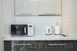 Кухня оборудована всем необходимым: плита, холодильник, микроволновая печь, электрический чайник. В наличии посуда и базовые продукты — чай, кофе, сахар и соль.