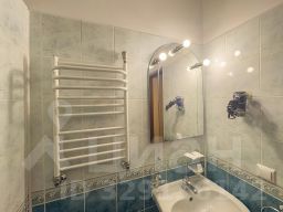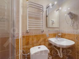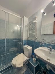 В ванной: туалет, раковина, душ-поддон, средства личной гигиены, фен, зеркало, набор полотенец.