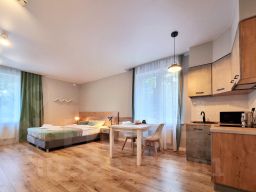 Комплекс апартаментов "Дюна состоит из семи уютных студий для проживания от 2-х до 4-х человек. В каждом апартаменте обустроена современная кухня (варочная панель, вытяжка, холодильник, чайник, необходимая посуда). Ванная комната оборудована качественной сантехникой, стиральной машинкой, душевой кабиной. Двухспальная кровать, в некоторых номерах имеется комфортный диван. В комнате имеется телевизор и Wi-Fi. Если путешествуете с малышом предоставим детскую кроватку и стульчик для кормления. Апартаменты находятся в центре города, но в стороне от шумных заведений, недалеко от моря и озера "Тихое" в другую сторону.