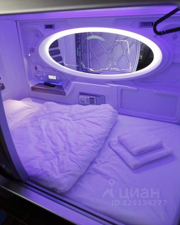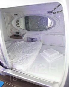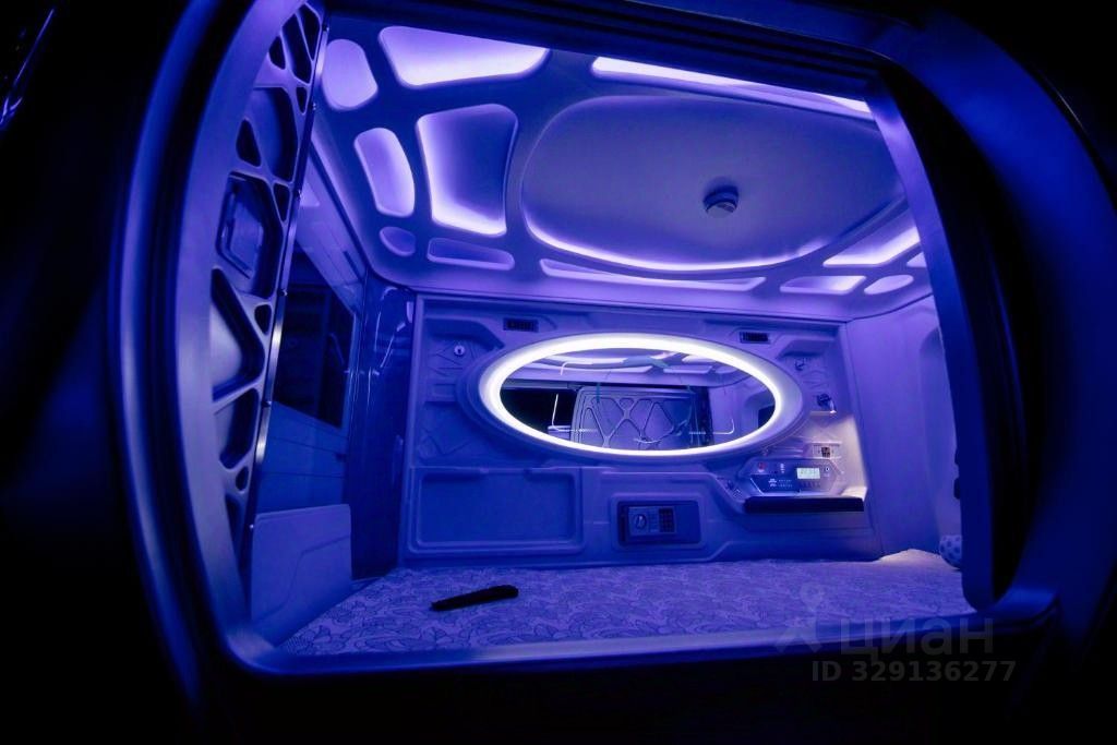 Капсула с ортопедическим матрасом, LED-освещением, розетками, вентиляцией и кондиционированием. Просмотр телевизора в капсуле возможен при наличии наушников. Четыре туалетные комнаты, расположены на 1 и 2 этажах, душевые кабины - на 2 этаже.
