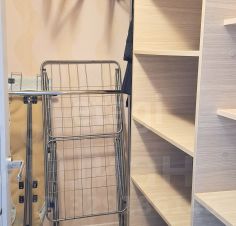 Функциональная кухня оборудована газовой варочной поверхностью, духовым шкафом, холодильником, микроволновой печью и стиральной машиной.