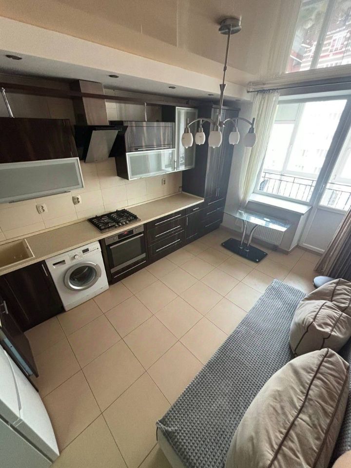 Кухня оснащена необходимой техникой: холодильник, плита, стиральная машина, посудомойка.